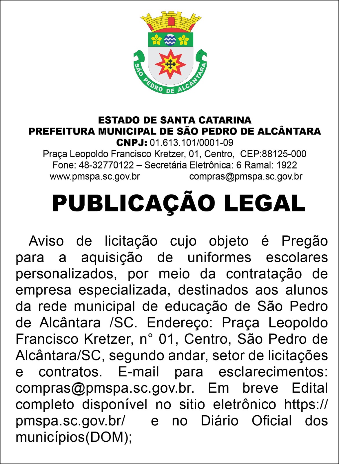 Aviso de licitação cujo objeto é Pregão para a aquisição de uniformes escolares personalizados, por