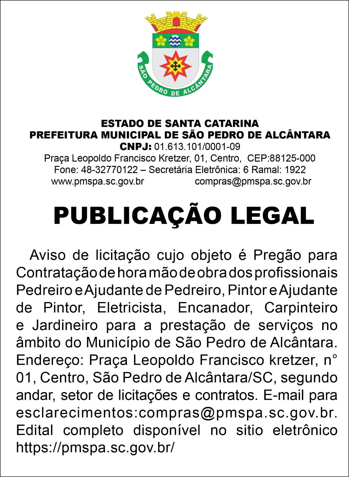 A Prefeitura Municipal de Santo Amaro da Imperatriz, através de seu Prefeito, convida a todos