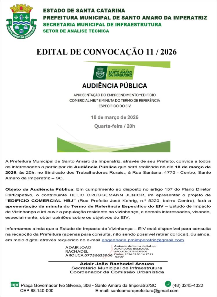 A Prefeitura Municipal de Santo Amaro da Imperatriz, através de seu Prefeito, convida a todos os interessados a participar da Audiência Pública que será realizada no dia 18 de março de 2026, às 20h, no Sindicato dos Trabalhadores Rurais., à Rua Santana, 4770 – Centro, Santo Amaro da Imperatriz – SC.