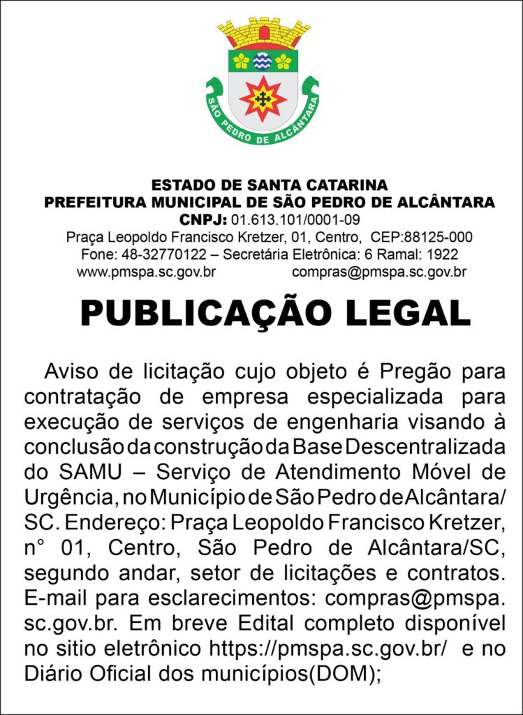 Aviso de licitação cujo objeto é Pregão para contratação de empresa especializada para execução de serviços de engenharia visando à conclusão da construção da Base Descentralizada do SAMU – Serviço de Atendimento Móvel de Urgência, no Município de São Pedro de Alcântara/SC. Endereço: Praça Leopoldo Francisco Kretzer, nº 01, Centro, São Pedro de Alcântara/SC, segundo andar, setor de licitações e contratos. E-mail para esclarecimentos: compras@pmspa.sc.gov.br. Em breve Edital completo disponível no sítio eletrônico https://pmspa.sc.gov.br/ e no Diário Oficial dos municípios(DOM).