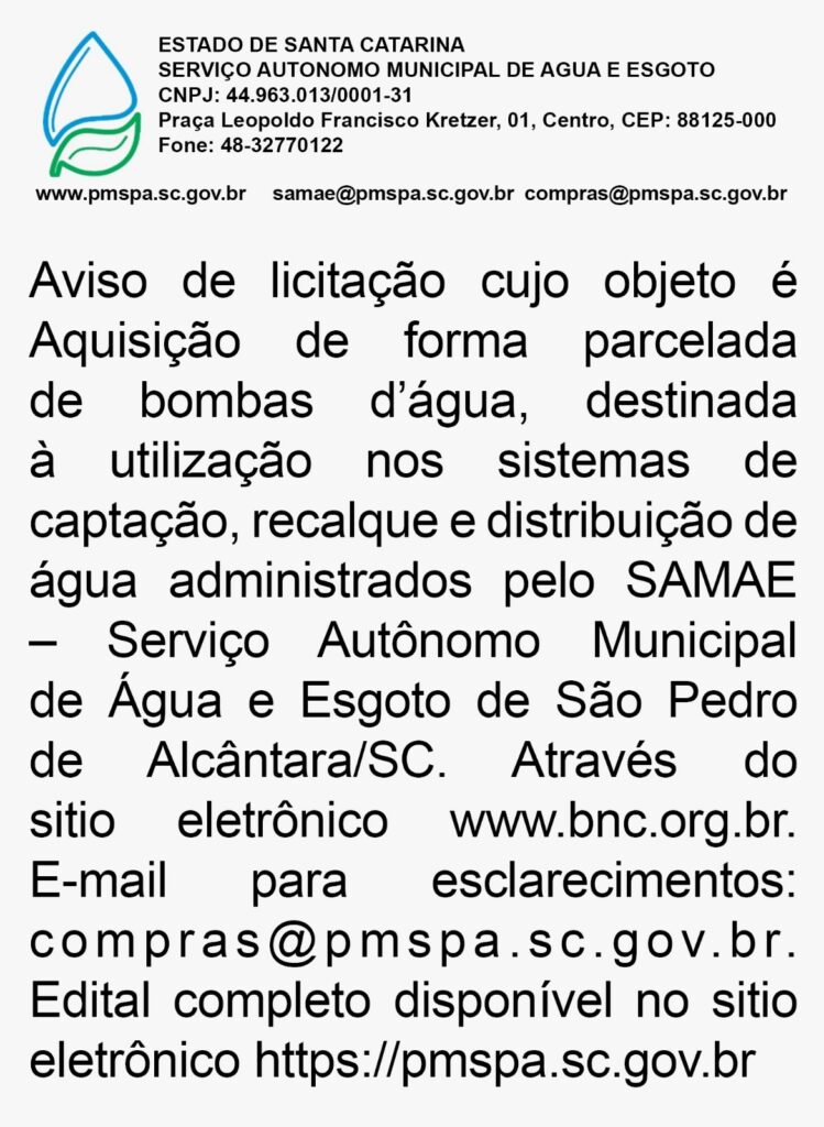 Aviso de licitação cujo objeto é Aquisição de forma parcelada de bombas d’água, destinada à utilização nos sistemas de captação, recalque e distribuição de água administrados pelo SAMAE – Serviço Autônomo Municipal de Água e Esgoto de São Pedro de Alcântara/SC. Através do sitio eletrônico www.bnc.org.br. E-mail para esclarecimentos: compras@pmspa.sc.gov.br. Edital completo disponível no sitio eletrônico https://pmspa.sc.gov.br